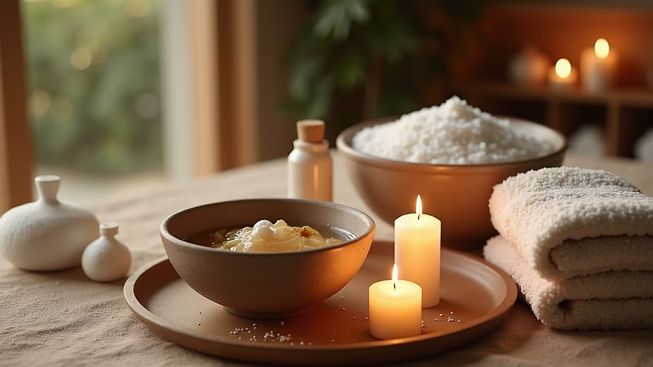 Home spa setup with bowls, towels, and candles arranged neatly