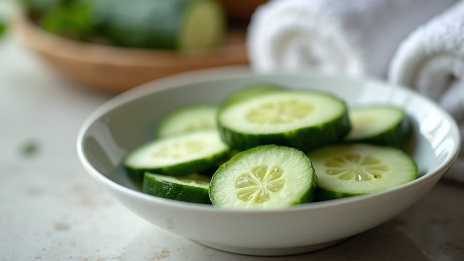 Close-up of spa essentials including cucumber slices and towels